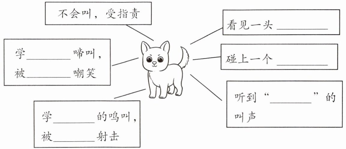 小狗在学叫过程中经历了种种奇遇,请你自读课文,完成思维导图。