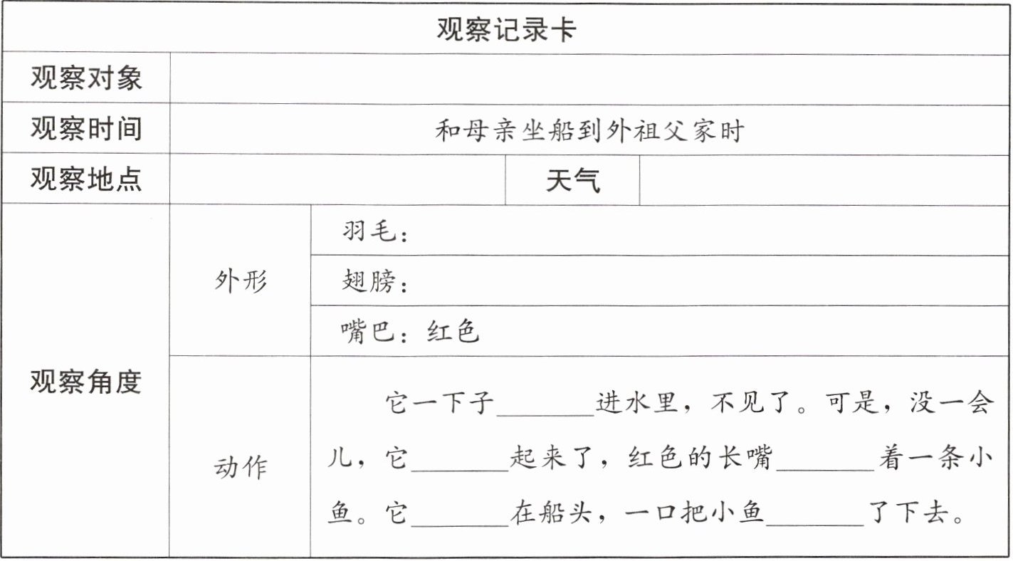 | |动作|它一下子____进水里,不见了。可是,没一会儿,它____起来了,红色的长嘴____着一条小鱼。它____在船头,一口把小鱼____了下去。|