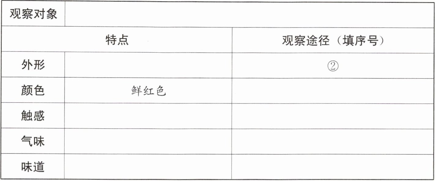 提示:可以调动多种感官观察事物,如:①用手摸;②用眼睛看;③用鼻子闻;④用耳朵听;⑤用嘴巴尝(确认安全、卫生的前提下)。