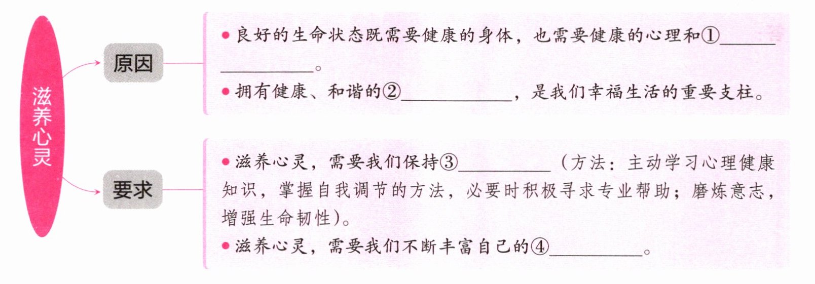滋养心灵,需要我们保持③______(方法:主动学习心理健康知识,掌握自我调节的方法,必要时积极寻求专业帮助;磨炼意志,增强生命韧性)。