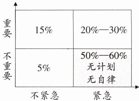 (1)该安排表中紧急但不重要的事情占到一半以上的时间,表现出无计划、无自律,往往会让人被事情牵着走,属于低效的时间安排。(2)从长远看,比如以一个月为例,建议把更多重要但不紧急的事情提前做好安排,按计划行事。