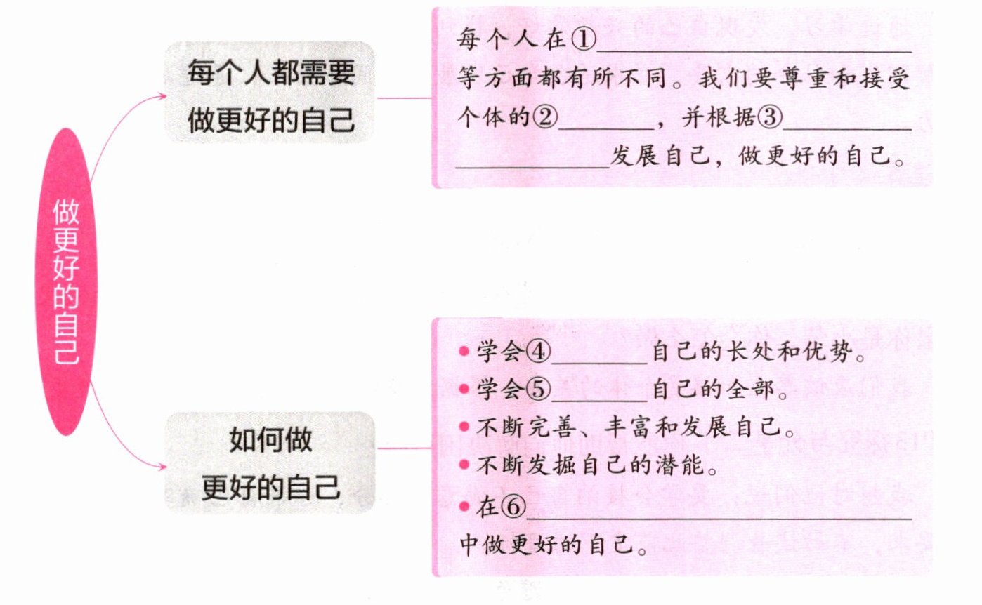 B --> D[每个人在① 等方面都有所不同。我们要尊重和接受个体的② ,并根据③ 发展自己,做更好的自己。]
