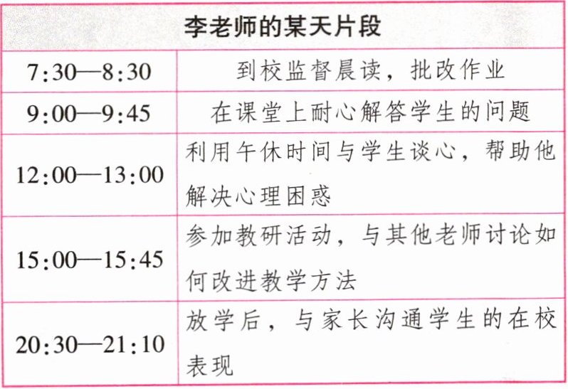 12:00-13:00利解用决午心休理时困惑间与学生谈心,帮助他15:00-15:45何参加改教进研教学活动方法,与其他老师讨论如20:30-21:10放表现学后,与家长沟通学生的在校