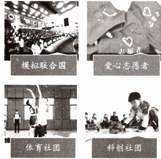 初中就是不一样,社团活动更有趣。此时,某校各个社团正在火热招新,让我们一起去看看。(模拟联合国、爱心志愿者、体育社团、科创社团图片)