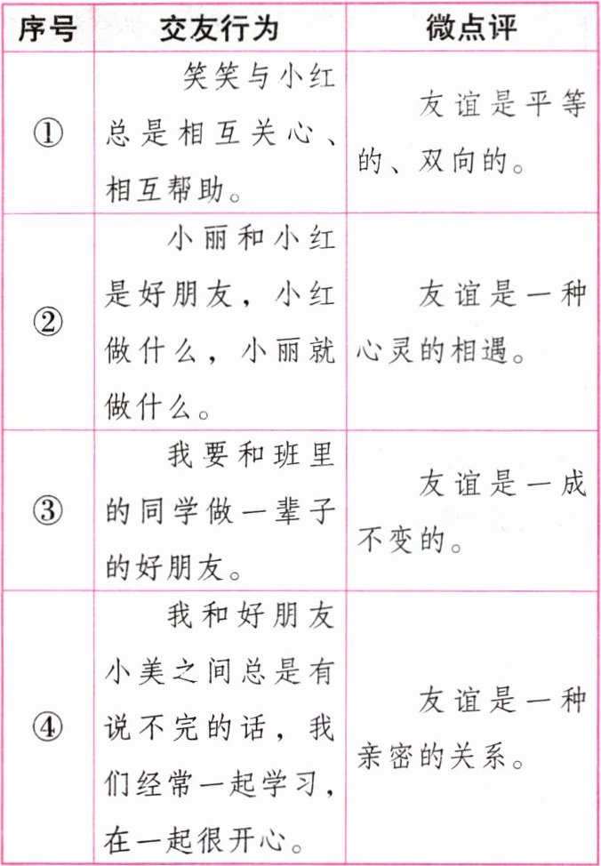 |④|我和好朋友小美之间总是有说不完的话,我们经常一起学习,在一起很开心。|友谊是一种亲密的关系。|