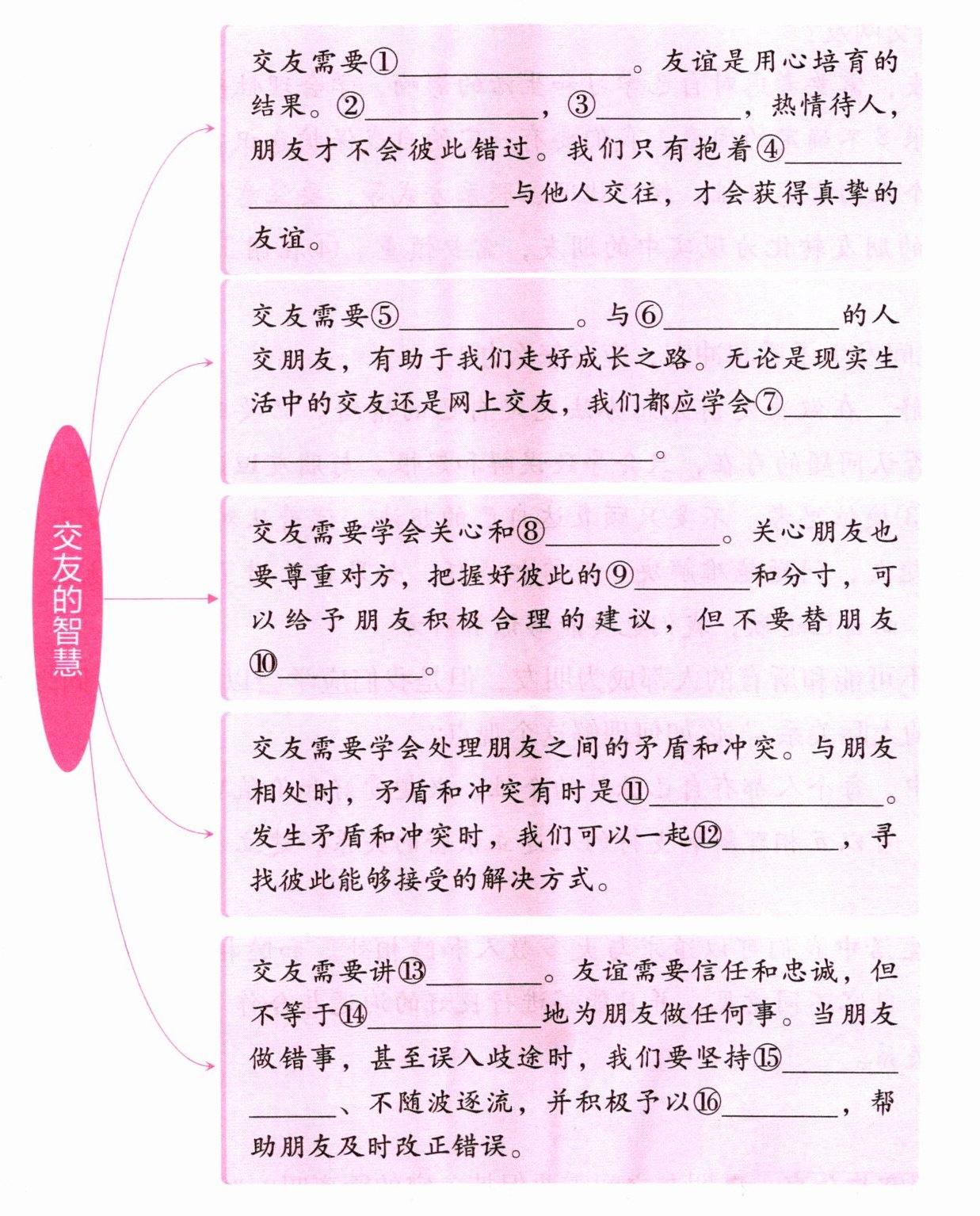①真诚和热情 ②敞开心扉 ③主动表达 ④真诚和热情的态度 ⑤慎重选择 ⑥品德高尚 ⑦理性辨别,做到慎交友、结好伴 ⑧尊重对方 ⑨界限 ⑩做决定 ⑪难以避免的 ⑫协商 ⑬原则 ⑭不加分辨 ⑮正确立场 ⑯规劝