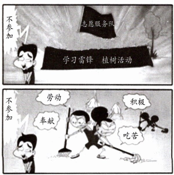 把漫画中文字“不参加”改为“我参与”或“加我一个”等正面性表述;把最左边人物改为面朝画中心,并加上表示积极上进的表情。修改后与“众人拾柴火焰高”的意思相匹配。