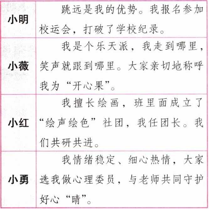 |小红|我擅长绘画,班里面成立了“绘声绘色”社团,我任团长。我们共研共进。|