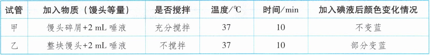 |甲|馒头碎屑+2mL唾液|充分搅拌|37|10|不变蓝|