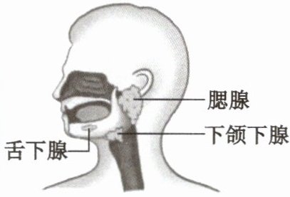人的口腔周围有3对较大的唾液腺:腮腺、下颌下腺和舌下腺。口腔黏膜里还有许多小唾液腺。这些大、小唾液腺分泌的液体混合在一起就是唾液。成人每天唾液的分泌量为1~1.5升,唾液中含有的唾液淀粉酶可以将食物中的淀粉分解成麦芽糖。此外,唾液可以湿润与溶解食物,使食物易于吞咽,并引起味觉。唾液还可以清洁和保护口腔,并有杀菌作用。