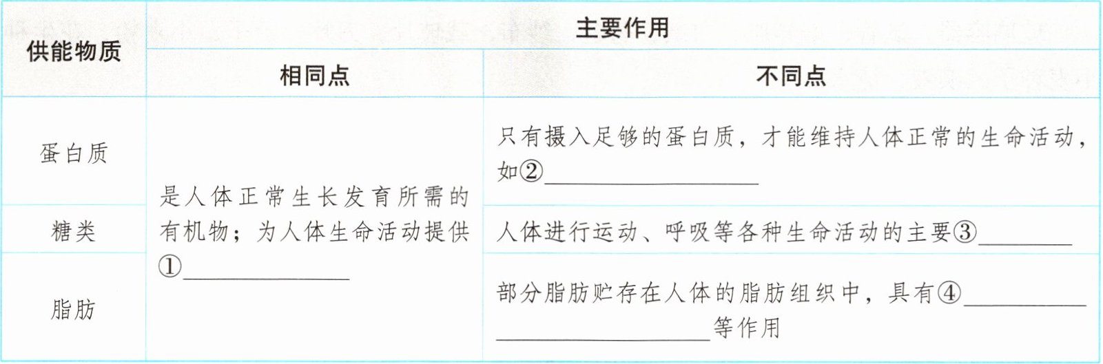 |蛋白质|是人体正常生长发育所需的有机物;为人体生命活动提供① |只有摄入足够的蛋白质,才能维持人体正常的生命活动,如② |