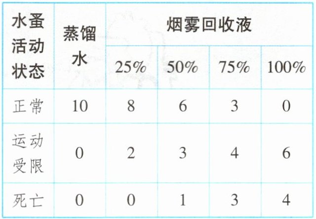 (3)①烟雾回收液的浓度(或烟雾回收液) ②形成对照 ③烟雾回收液浓度越大,水蚤的活动状态越差 ④提示:与珍爱生命、关爱他人、健康生活相关的合理答案皆可。如吸烟有害身体健康,及时戒烟;严禁吸烟;不吸二手烟等。