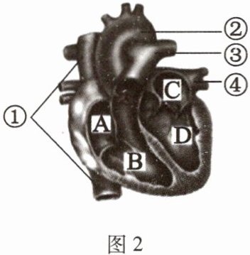 (2) 哈维观察濒临死亡的哺乳动物的心脏跳动,发现心脏是由肌肉组织构成的。我们在观察完整的离体猪心(如图2)时发现,壁较厚的是[ ]______,从[①]往心脏内注水后,水从[ ]______流出。图2中血管②的名称是______,其内流动的是______(填“动脉血”或“静脉血”)。[C]的血液只能流向[D],主要是心房和心室之间有______。