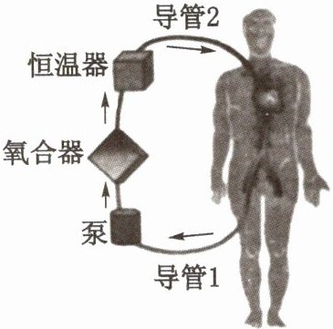 3. 体外膜氧合器(ECMO),是一种为患者进行体外呼吸与血液循环的医疗设备。使用时,先用导管1将血液从人体静脉引出,通过一系列装置后,血液经导管2回到人体的动脉或静脉内(如图)。下列有关叙述不正确的是( )