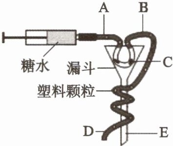 ①准备注射器、橡皮管、漏斗、相同大小的塑料颗粒等材料和适量的糖水;