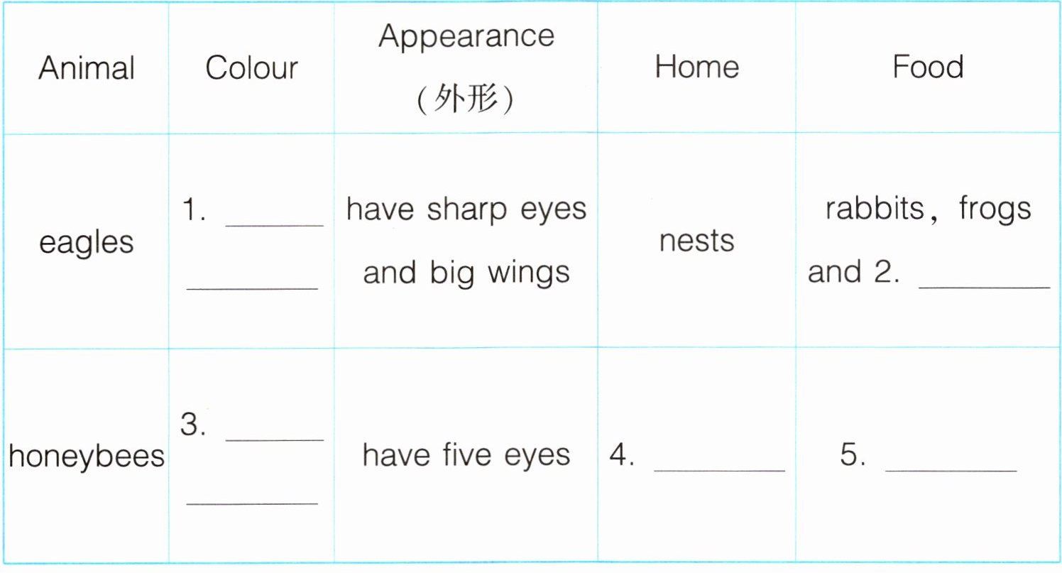 Eagles are big birds. Some eagles are white and brown. They have sharp (锐利的) eyes and big wings (翅膀). They can fly very high. Eagles live in big nests in tall trees. They build nests (筑巢) with sticks (树枝). Eagles eat rabbits,frogs and birds. They catch (捕捉) small animals with their sharp claws (爪子).