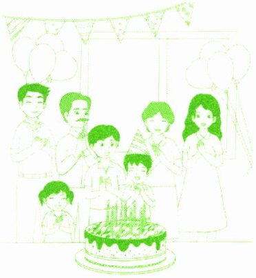 六、今天是小美的生日,她的生日聚会真热闹啊。请你仔细观察图片,提出几个与数字相关的问题并回答吧。