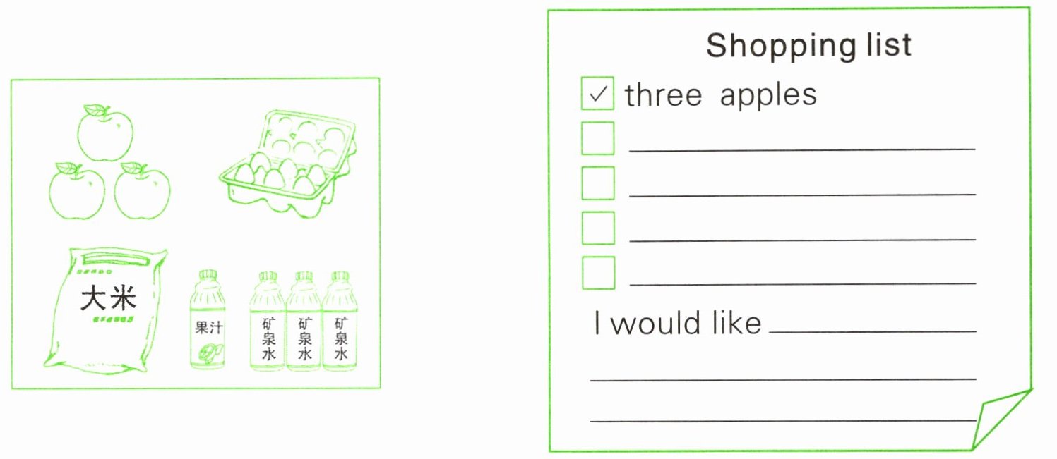 四、请你根据图片提示,帮小美完善她的购物清单。