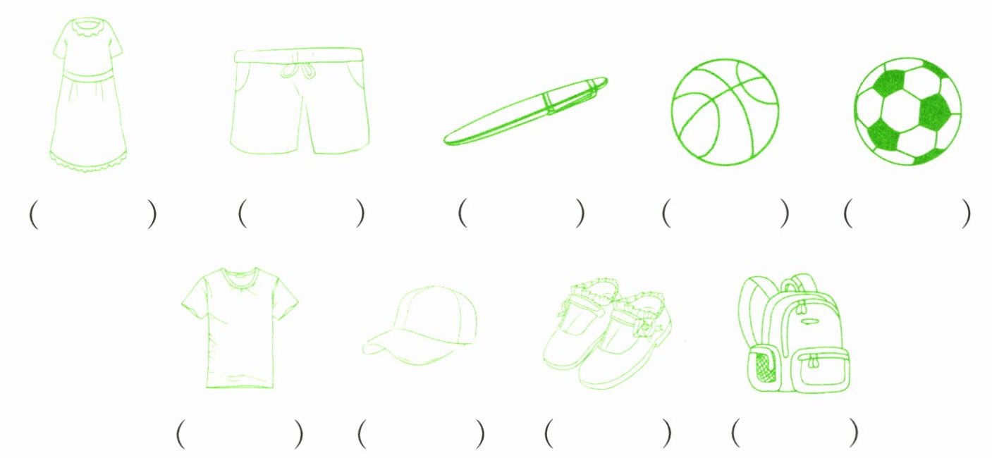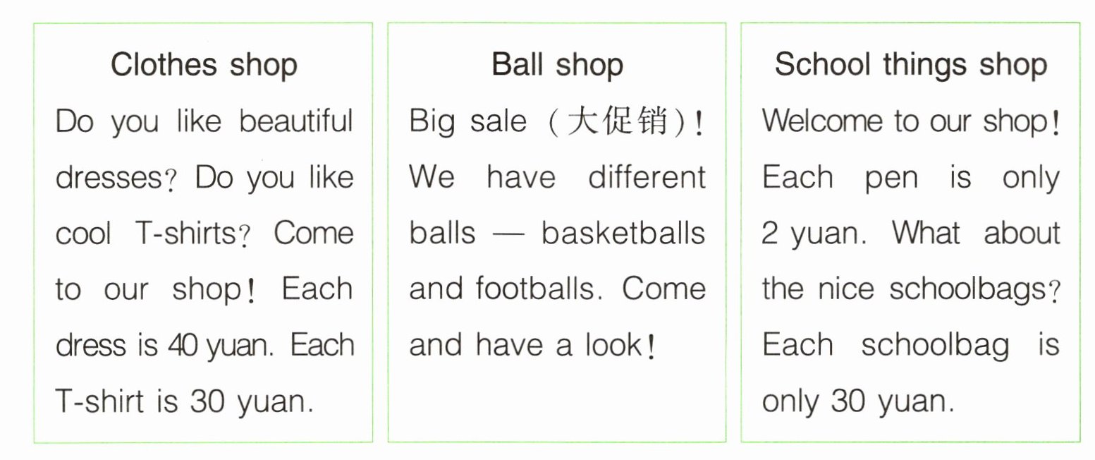 任务一:根据海报内容,在三个商店所售物品下面的括号里画“√”。
