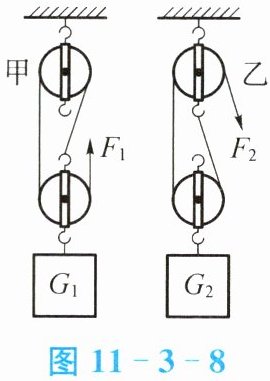 12. 如图11 - 3 - 8所示,规格完全相同的滑轮用相同的绳子绕成甲、乙两个滑轮组,分别提起重为$G_{1}$、$G_{2}$的两个物体,比较它们的省力情况和机械效率(不计摩擦),下列说法中正确的是(