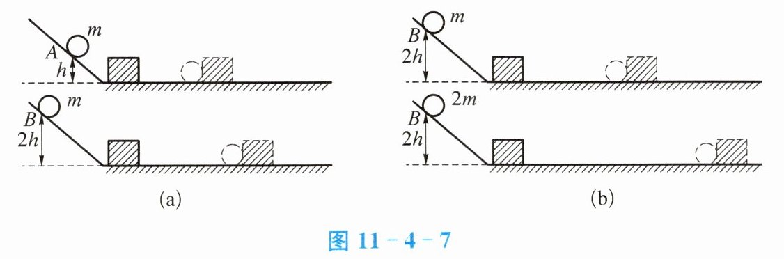 ① 让质量相同的两个小球沿同一光滑斜面分别从A处和B处开始向下运动,然后与放在水平面上的纸盒相碰,纸盒在水平面上移动一段距离后静止,如图11-4-7(a)所示。
