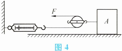 5. 如图 4 所示,物体 $ A $ 在水平拉力 $ F $ 的作用下,沿水平面以 $ 0.4 \, m/s $ 的速度做匀速直线运动,弹簧测力计的示数为 $ 5 \, N $。若物体 $ A $ 匀速运动 $ 2 \, s $,拉力 $ F $ 做功为