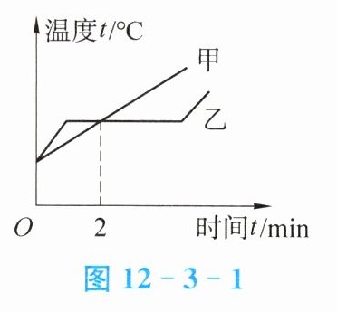 2. 用相同的装置给质量相等的甲、乙两种物质(固体)加热,它们的温度随时间变化情况的图像如图12-3-1所示。当加热至$2\mathrm{min}$时,物质甲吸收的热量