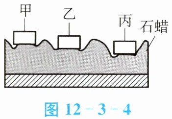12. 将质量相同的三块金属甲、乙、丙从相同初温加热到相同末温后,放到表面平整的石蜡上。经过一定时间后,观察到的现象如图12-3-4所示,则三块金属的比热容(