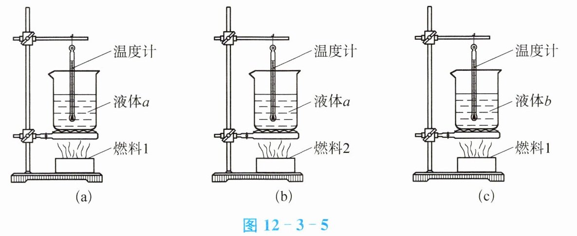 14. 图12-3-5(a)、(b)、(c)中的装置完全相同,燃料的质量都是$10\mathrm{g}$,烧杯内的液体质量和初温也均相同。