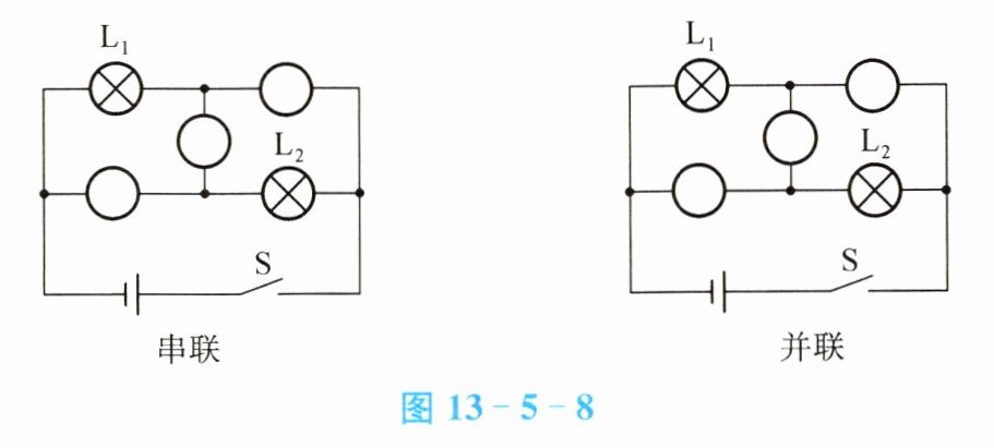 12. 如图13-5-8所示,现有两个灯泡既可以串联也可以并联,则在串联时,三个圆圈中应分别填入哪种电表符号,在并联时,又应填入哪种电表符号?