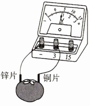 14. 你了解“水果电池”吗? 找一个西红柿(熟透的较好),然后将连在电压表上的铜片和锌片插入西红柿中,这样就制成了一个“水果电池”,如图13-5-10所示。观察电压表的接线和指针偏转可知,锌片是电池的