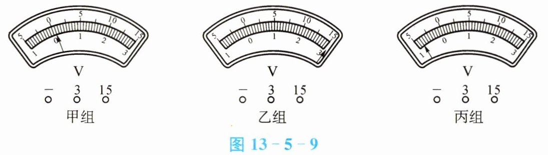 13. 甲、乙、丙三组同学在测电压的实验中,分别发现电压表出现了如图13-5-9所示的现象,请你分析他们在实验时出现问题的可能原因。