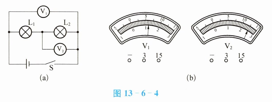 5. 图13-6-4(a)所示的电路中,电压表所用的量程不明,当电路闭合后,$V_{1}和V_{2}$的示数分别如图13-6-4(b)所示。则$V_{1}$用的量程是