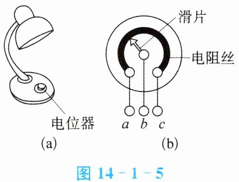 10. 图14-1-5(a)为可调节亮度的台灯示意图,图14-1-5(b)为其用于调光的电位器结构图,$a$、$b$、$c$是它的三个接线柱,$a$、$c$分别与弧形电阻丝的两端相连,$b$与金属滑片相连,转动旋钮,滑片在弧形电阻丝上滑动即可调节灯泡亮度,下列分析中正确的是(