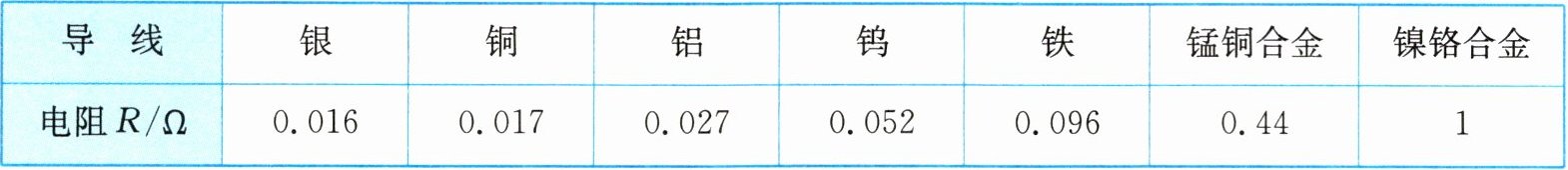 7. 下表列出了一些材料制成的长$1\mathrm{m}$、横截面积为$1\mathrm{mm}^{2}的导线在20^{\circ}\mathrm{C}$时的电阻值。
