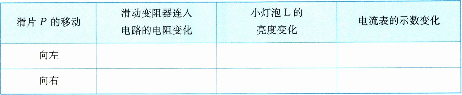 |滑片$P$的移动|滑动变阻器连入电路的电阻变化|小灯泡$\mathrm{L}$的亮度变化|电流表的示数变化|