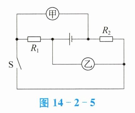 5. 如图14-2-5所示,已知$R_{1}:R_{2}= 2:1$。当开关$S$闭合,甲、乙两表均为电压表时,两表示数之比$U_{甲}:U_{乙}= $