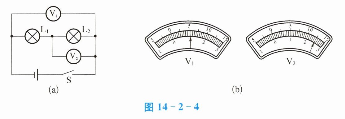 4. 如图14-2-4(a)所示的电路中,电灯$L_{1}的电阻为10\Omega$,开关闭合后,电压表$V_{1}和V_{2}$的示数分别如图14-2-4(b)所示,则$L_{2}$两端的电压为