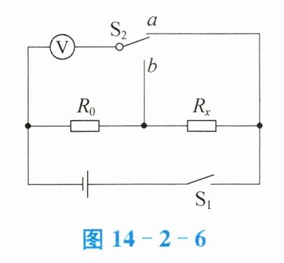 6. 如图14-2-6所示的电路中,电阻$R_{0}= 12\Omega$。闭合开关$S_{1}$,将单刀双掷开关$S_{2}掷于a$端,电压表示数为$2.5V$;将$S_{2}切换到b$端,电压表示数为$1.5V$,则电阻$R_{x}$的阻值为