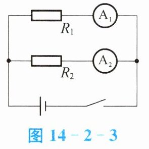 2. 如图14-2-3所示,电源电压不变,闭合开关后,电流表$A_{1}的示数为0.5A$,电流表$A_{2}的示数为0.3A$,则$R_{1}:R_{2}= $