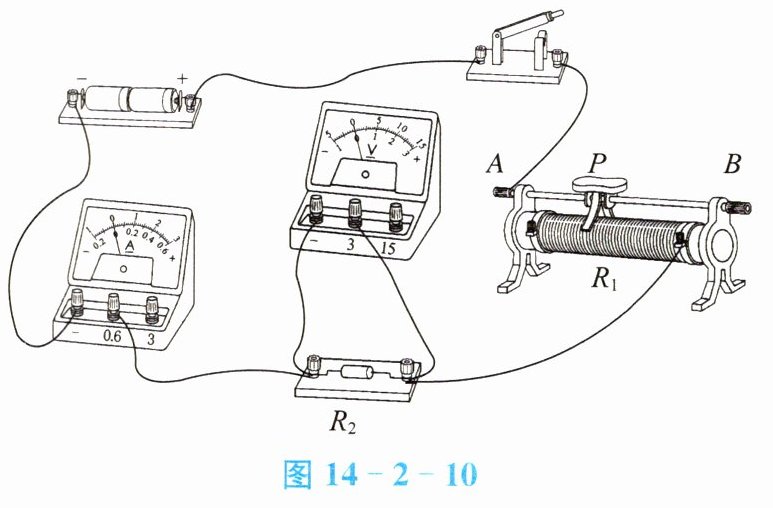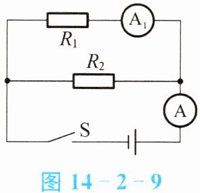 10. 如图14-2-9所示,$R_{1}的电阻为20\Omega$,当开关$S$闭合后,电流表$A的示数为0.5A$,电流表$A_{1}的示数为0.3A$。求: