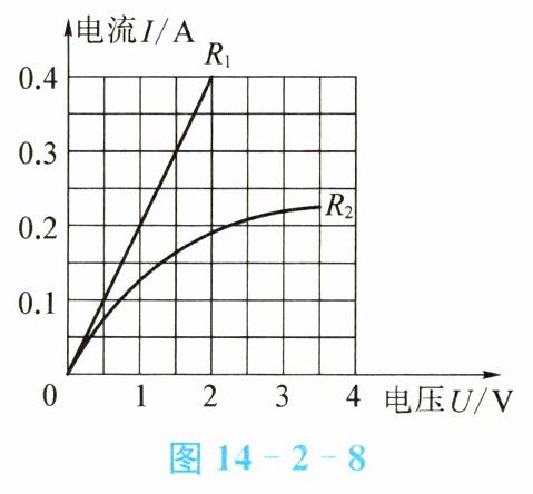 9. 小明在研究通过导体的电流时,根据测量数据绘制出如图14-2-8所示的$I-U$图像。对此作出的判断中,$\boldsymbol{错误}$的是(