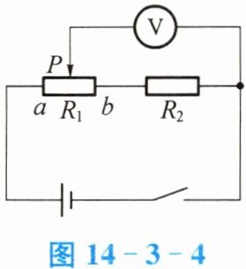 4. 如图14-3-4所示,滑动变阻器$R_1$的最大阻值是200Ω,电阻$R_2$是300Ω,电源电压是6V且保持不变,当滑动变阻器的滑片P由a滑到b,电压表的示数相应的由