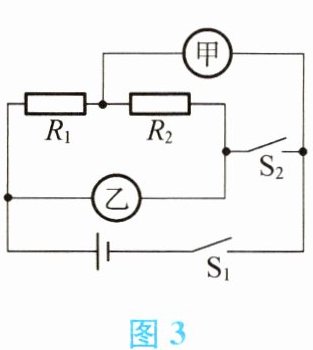 5. 如图3所示,电源电压不变,$R_{1}= 10Ω$,$R_{2}= 15Ω$,当$S_{1}$、$S_{2}$都闭合时,若甲、乙都是电压表,则$U_{甲}:U_{乙}=$