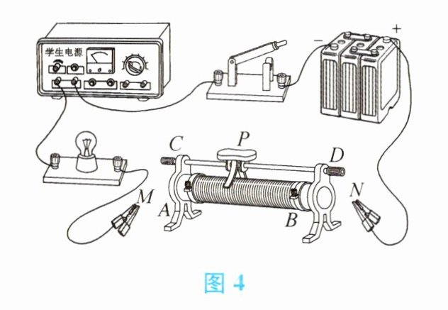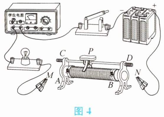 6. 如图4所示的电路,M夹在A端,N夹在D端,则闭合开关前应将滑片P移到