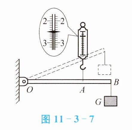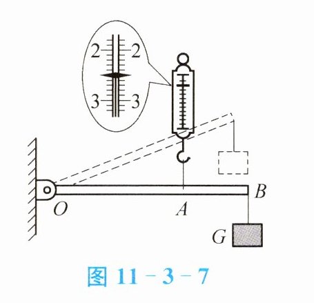 6. 如图11 - 3 - 7所示,在测算杠杆机械效率的实验中,竖直向上匀速拉动弹簧测力计,使挂在杠杆$OB$下方的物块缓慢上升至虚线位置,弹簧测力计的示数$F$为