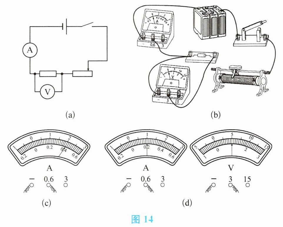 。(5)排除故障后,将滑片P移到某一位置时,两表读数如图14(d)所示,小军计算得出所测电阻的阻值$R= $