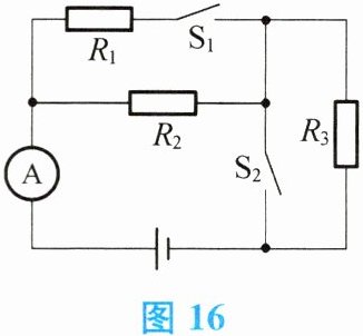 22. 如图16所示的电路中,电源电压为12V,$R_{2}= 20Ω$。当$S_{1}$、$S_{2}$闭合时,电流表示数为0.8A。当$S_{1}$、$S_{2}$断开时,电流表示数为0.2A。求$R_{1}和R_{3}$的值。
