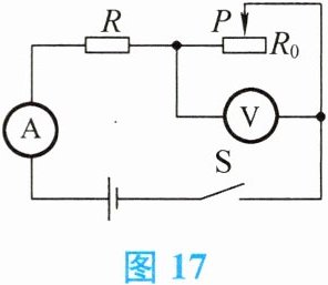 23. 如图17所示,电源电压保持不变,闭合开关S后,滑动变阻器$R_{0}$的滑片P在移动过程中,电压表的示数变化范围为0~4V,电流表的示数变化范围为0.5~1A,求: