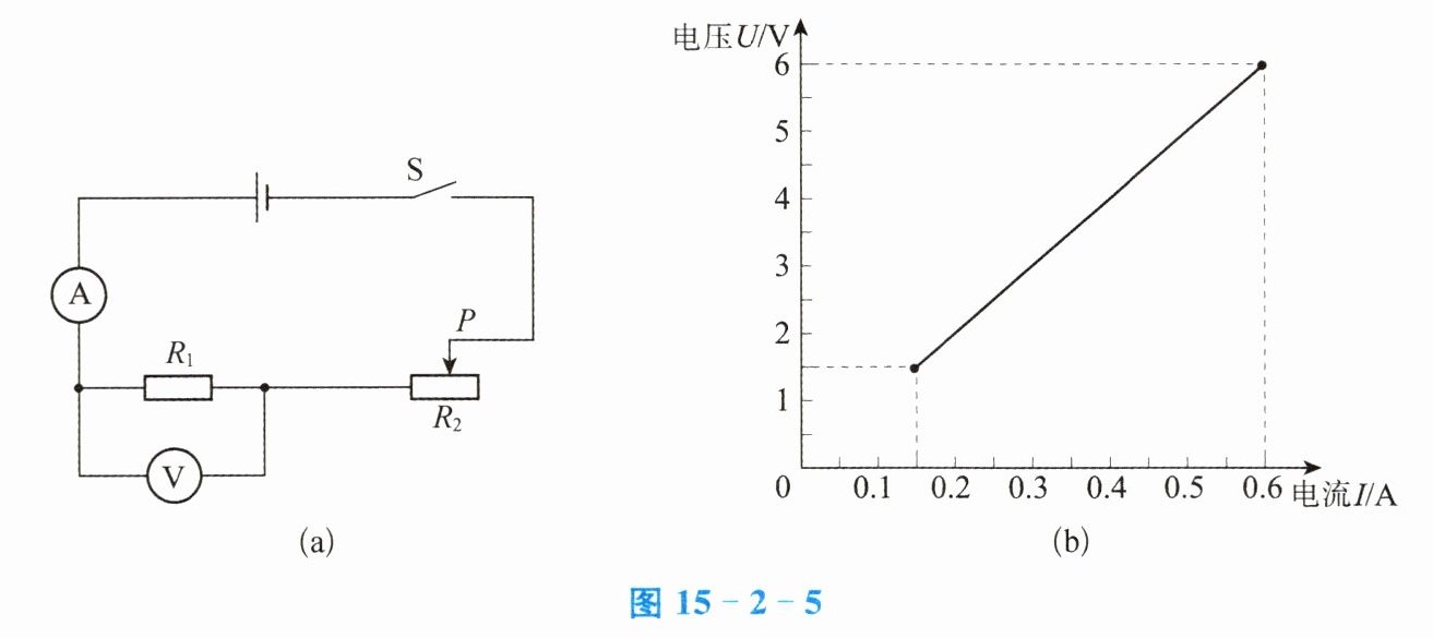 10. 某兴趣小组同学想探究串联电路中电阻消耗的电功率与电流的关系,设计电路如图15-2-5(a)所示。滑动变阻器的滑片$P$从最右端向最左端移动的过程中,$R_1的U-I$图像如图15-2-5(b)所示。求: